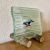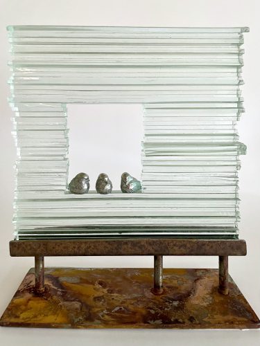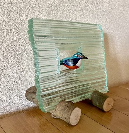glass art raamwerk van glas met houten vogelglass art met vogel van hout op natuurlijke standaard. 20x20cm € 250 -