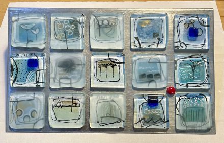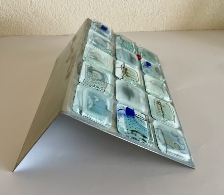 glass-art landschapGebogen, zelfstandig staand glas art object. 25 x 30 cm. Kan lichtje achter geplaatst worden. € 150 -